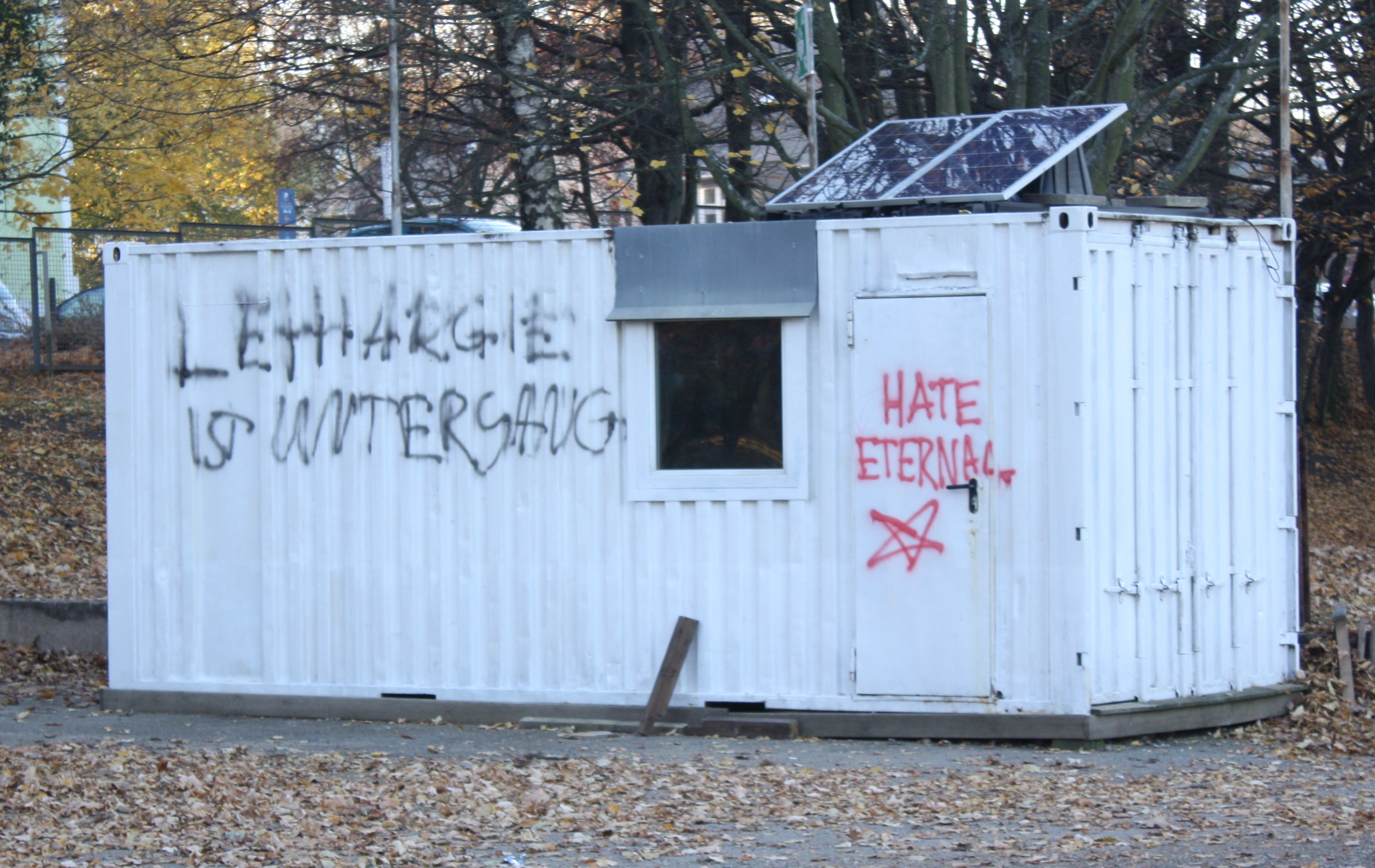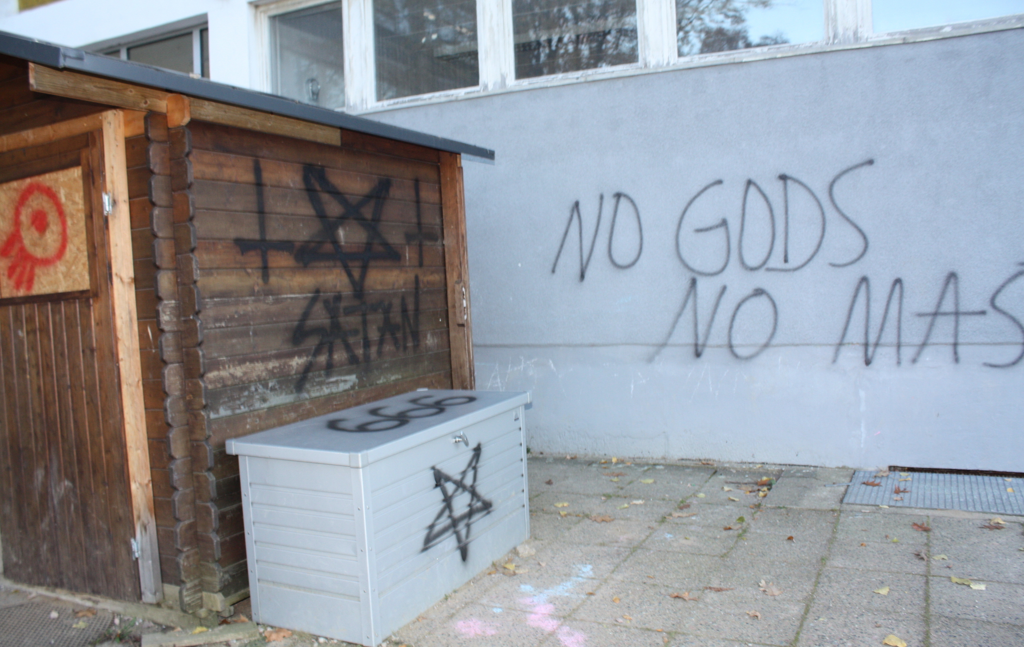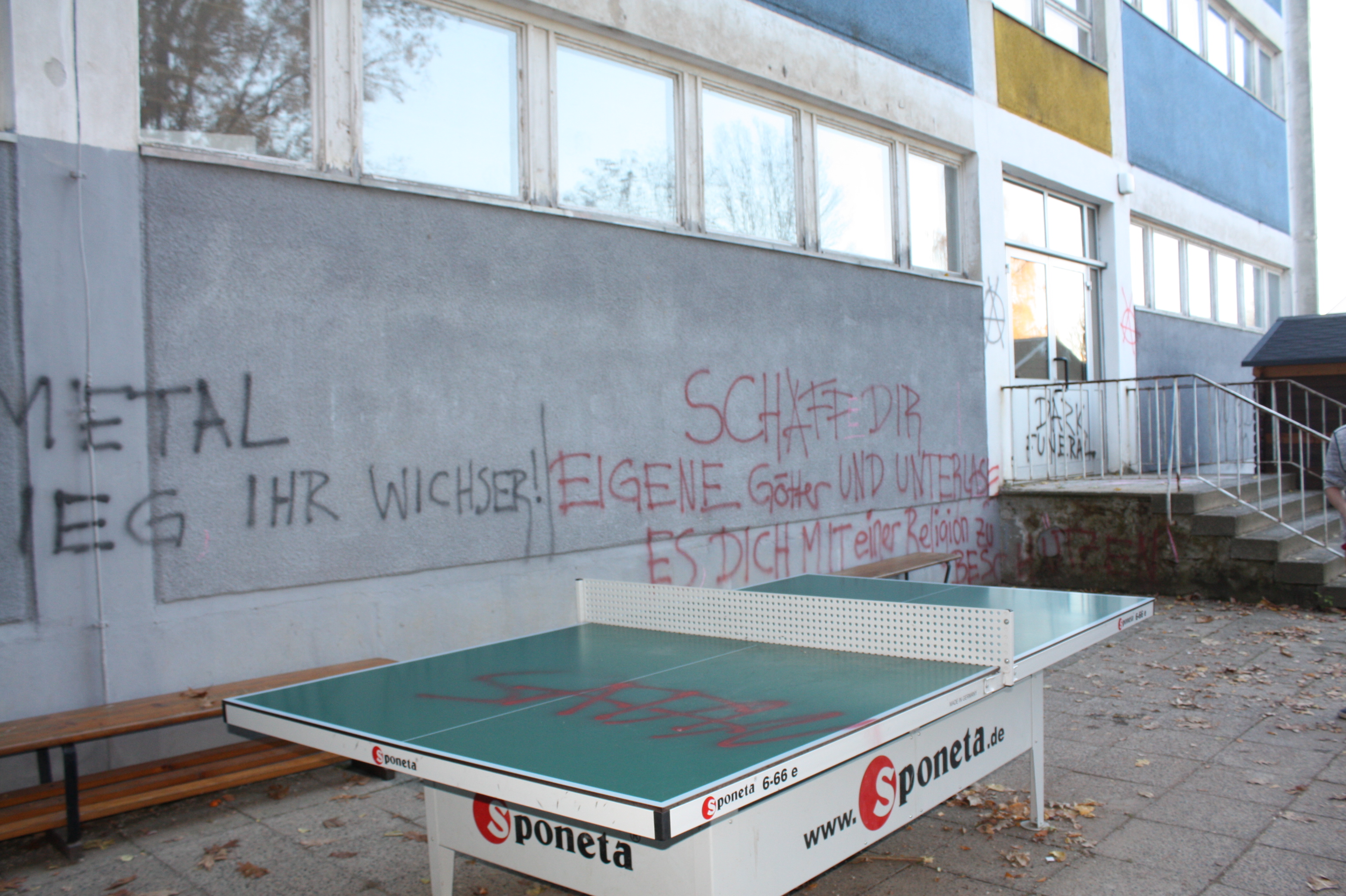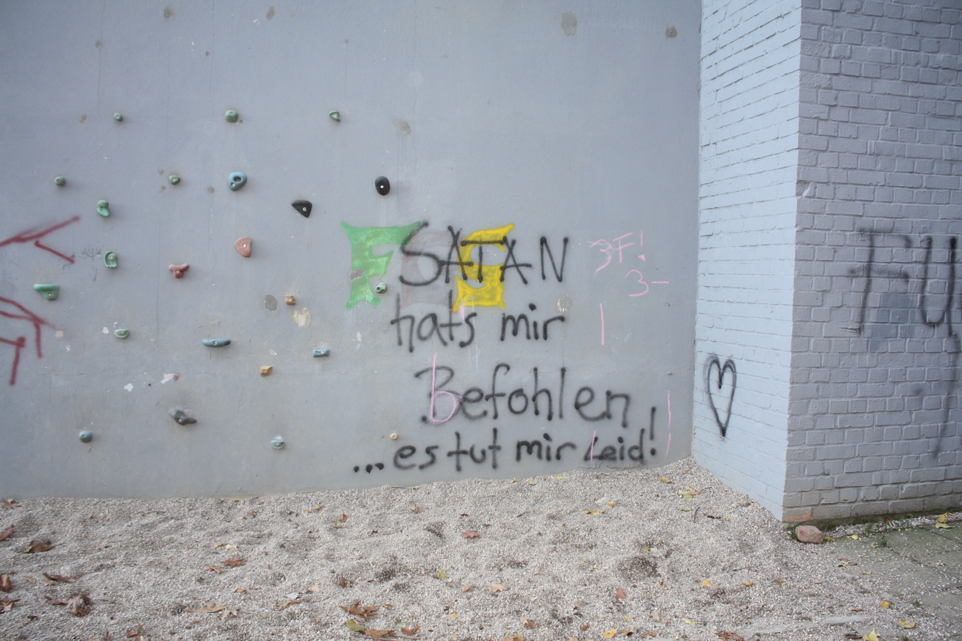 Als wir am Montagmorgen in die Schule kamen, sahen wir, dass der Hintereingang zugesprayt war.Die Tischtennisplatte und die Hauswände der Schule waren beschmiert. Wir alle sind der Meinung, dass dies sehr respektlos gegenüber der FGS ist. Da dies eine mutwillige Sachbeschädigung darstellt und solche Texte, wie: "Satan hat es mir befohlen...", kein guter Umgang für die ganzen Schüler der FGS sind. Wir alle hoffen das die Sprayer bald gefunden und für den Schaden auf kommen werden.